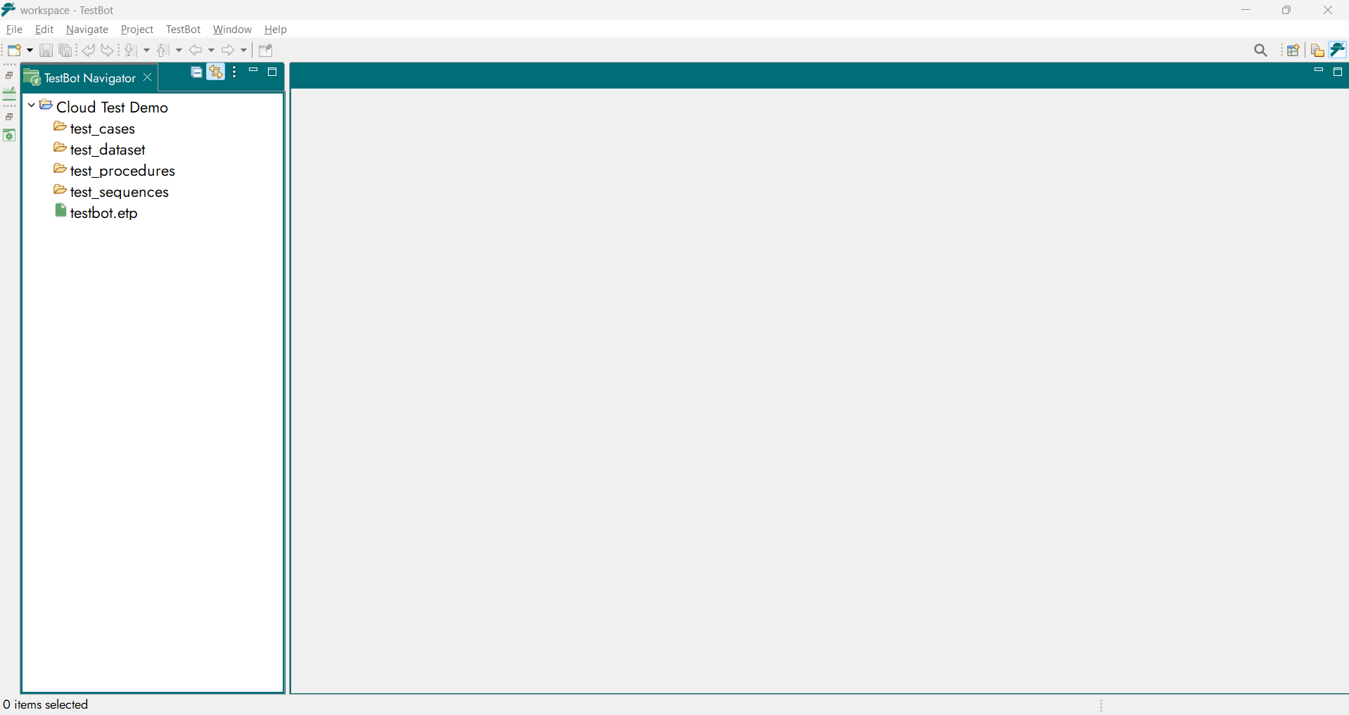 The new TestBot project appears in the Navigator. From here, you can begin creating test methods, importing or creating test data, mapping tests to data, and configuring agents for execution.