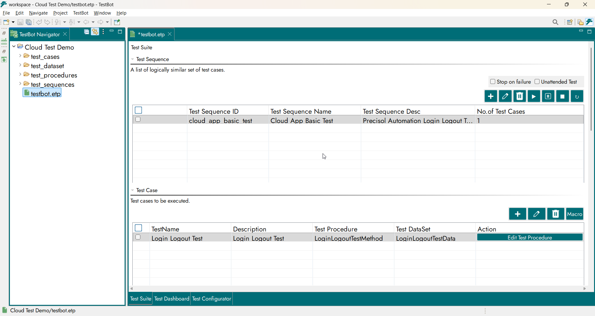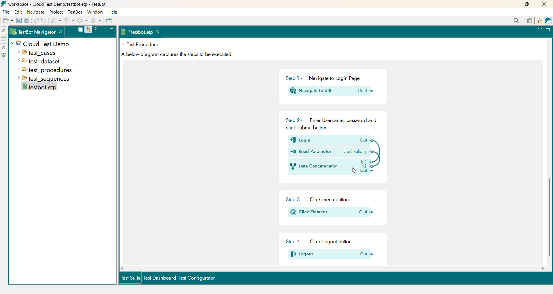 A Test Procedure defines the logical behavior of the test. It consists of Test Steps and Functional Blocks provided by TestBot Agents, describing how the test is executed.