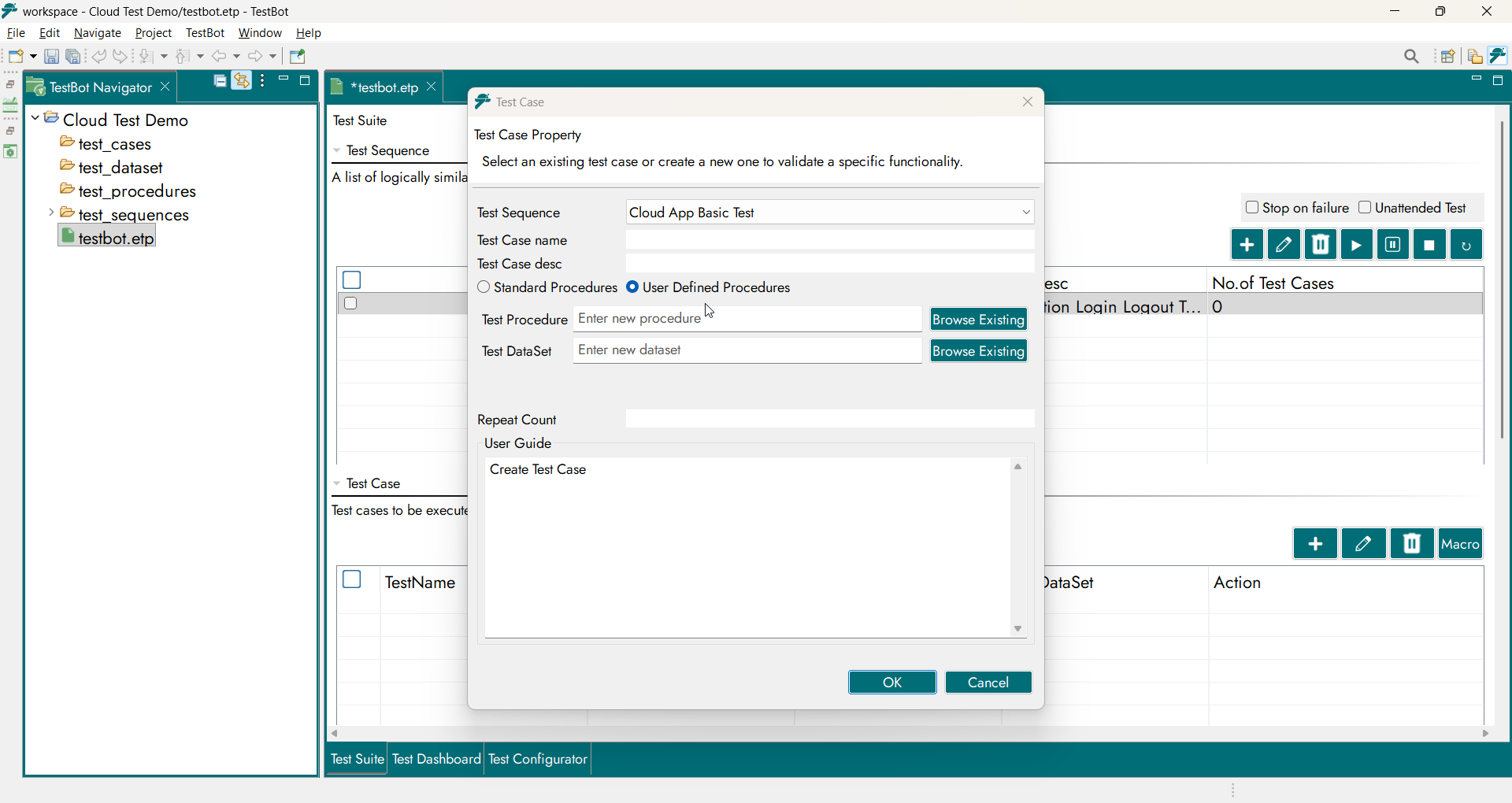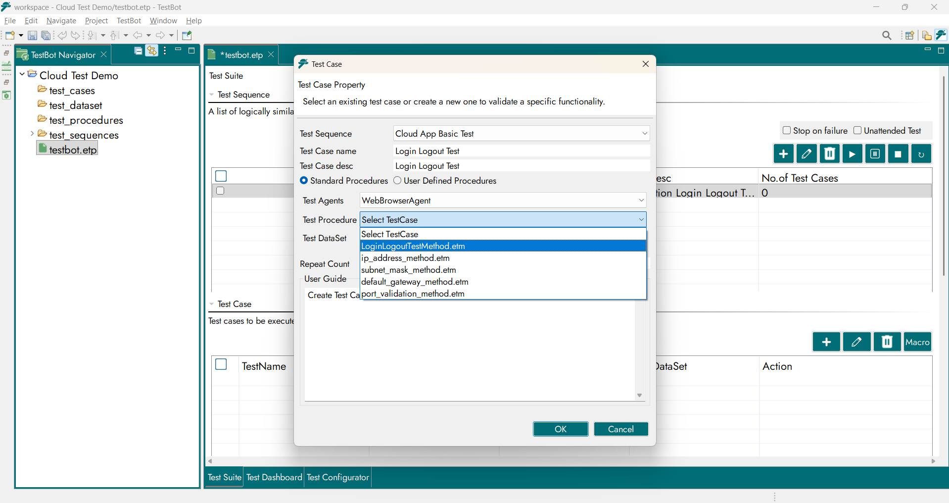 From the Project Editor, users add Test Cases inside a Test Sequence. While creating a Test Case, users select the Procedure Type: