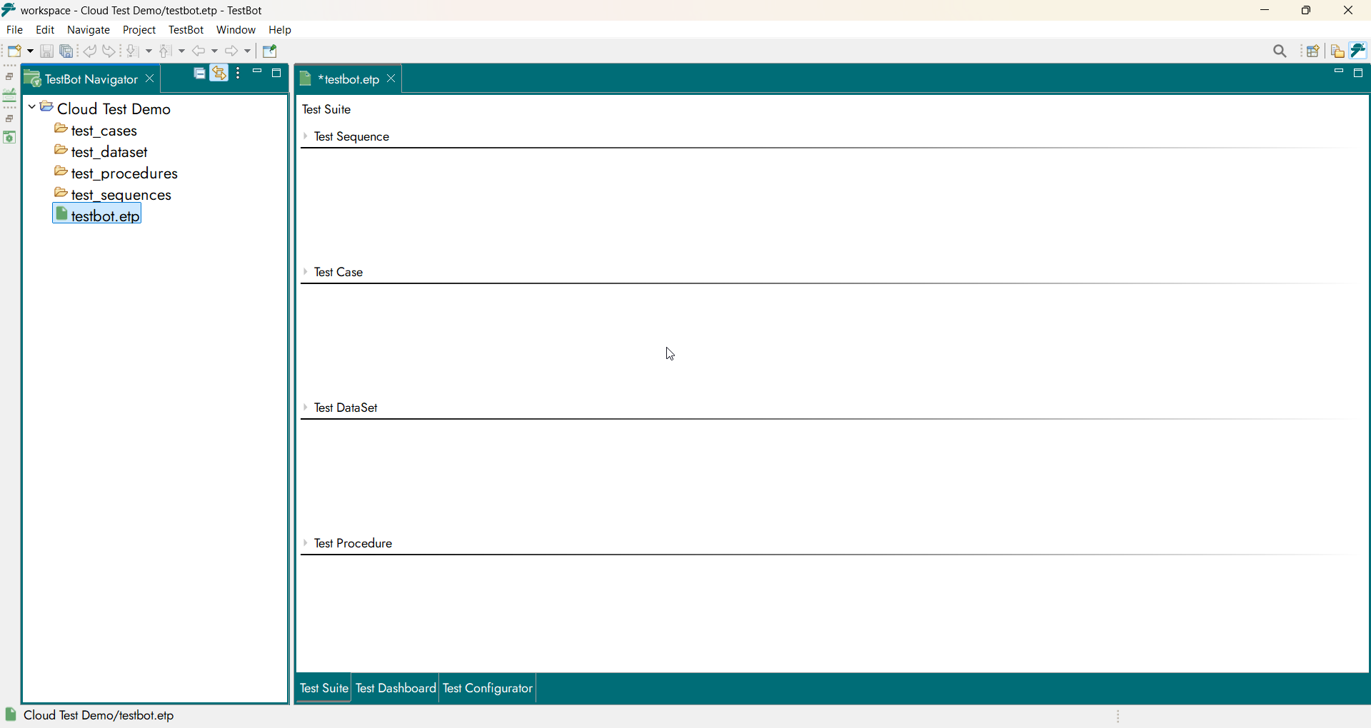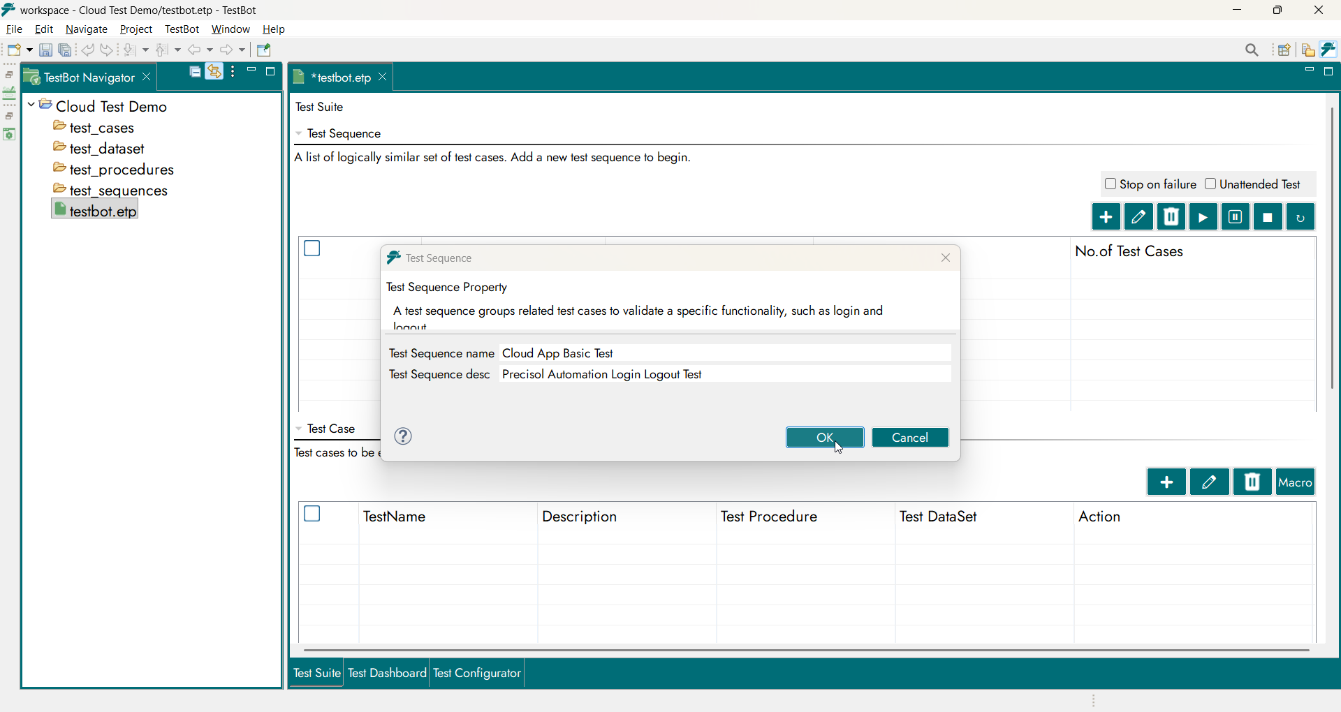 Using the TestBot Project Editor, users begin test creation by adding a Test Sequence. The Test Sequence acts as the top-level execution container and determines how individual test steps are sequenced and executed.
