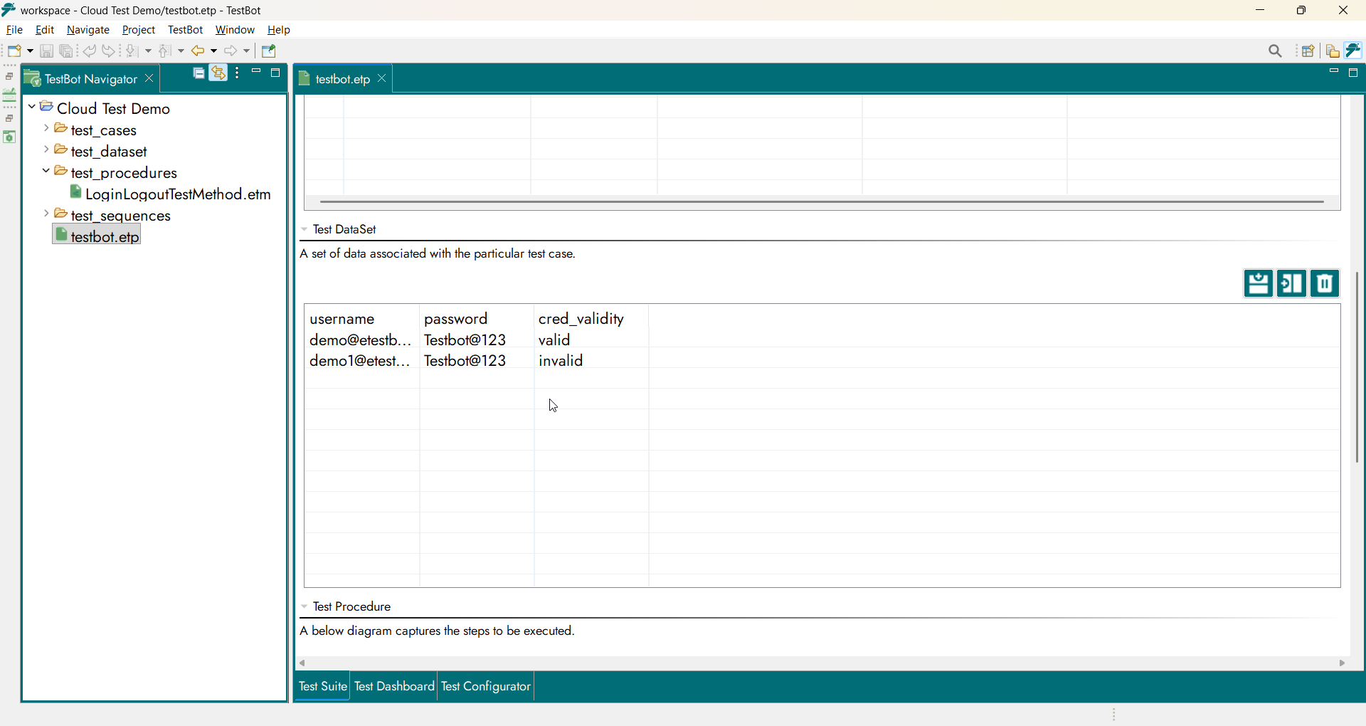 Test DataSet contains structured input values required during execution. It defines what DataSet is supplied when a Test Procedure runs.