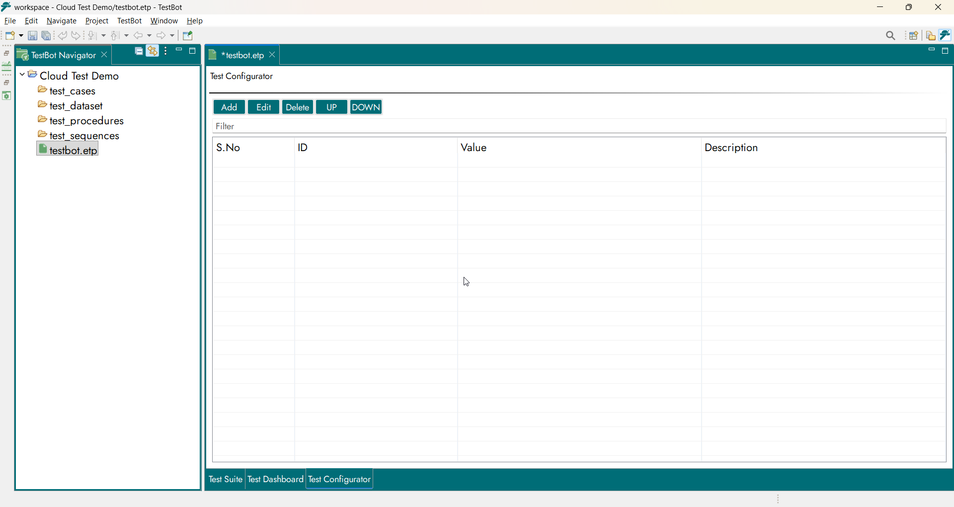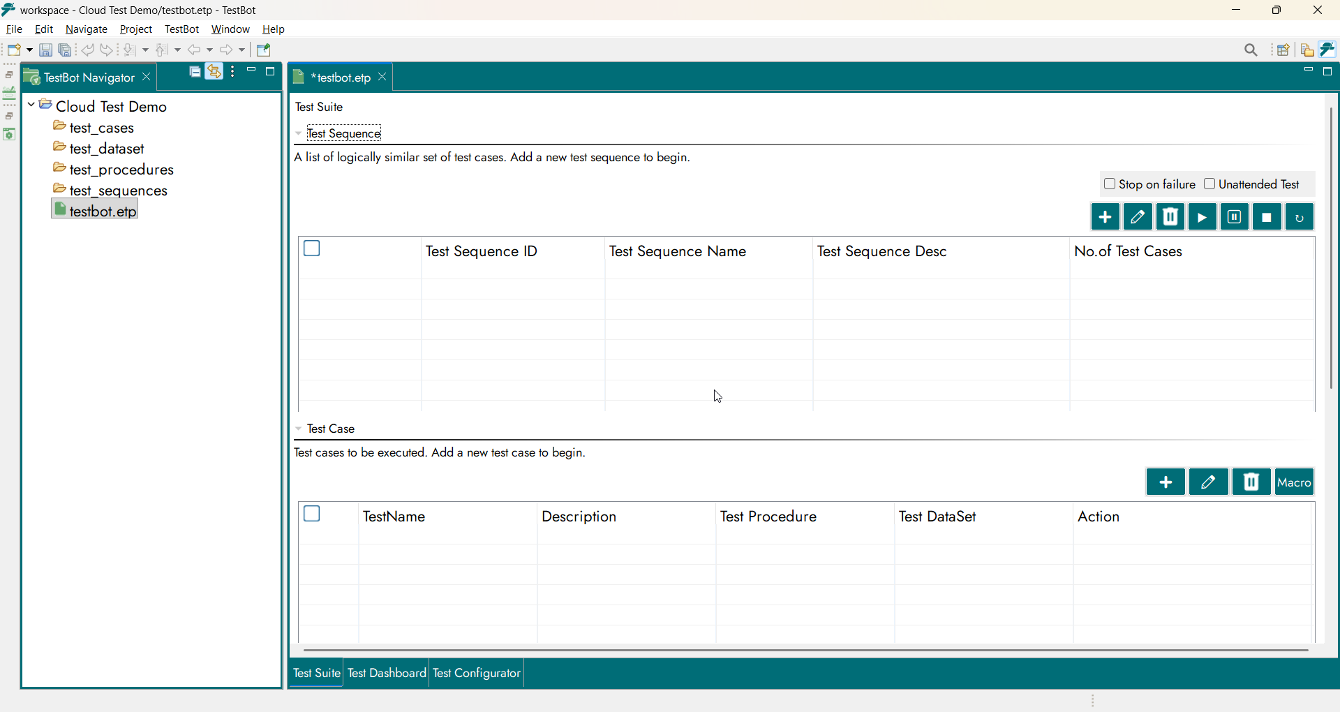 The Test Suite is the top-level container for all test assets within a TestBot project. It provides structure and governance for test development. Within a Test Suite, users can: