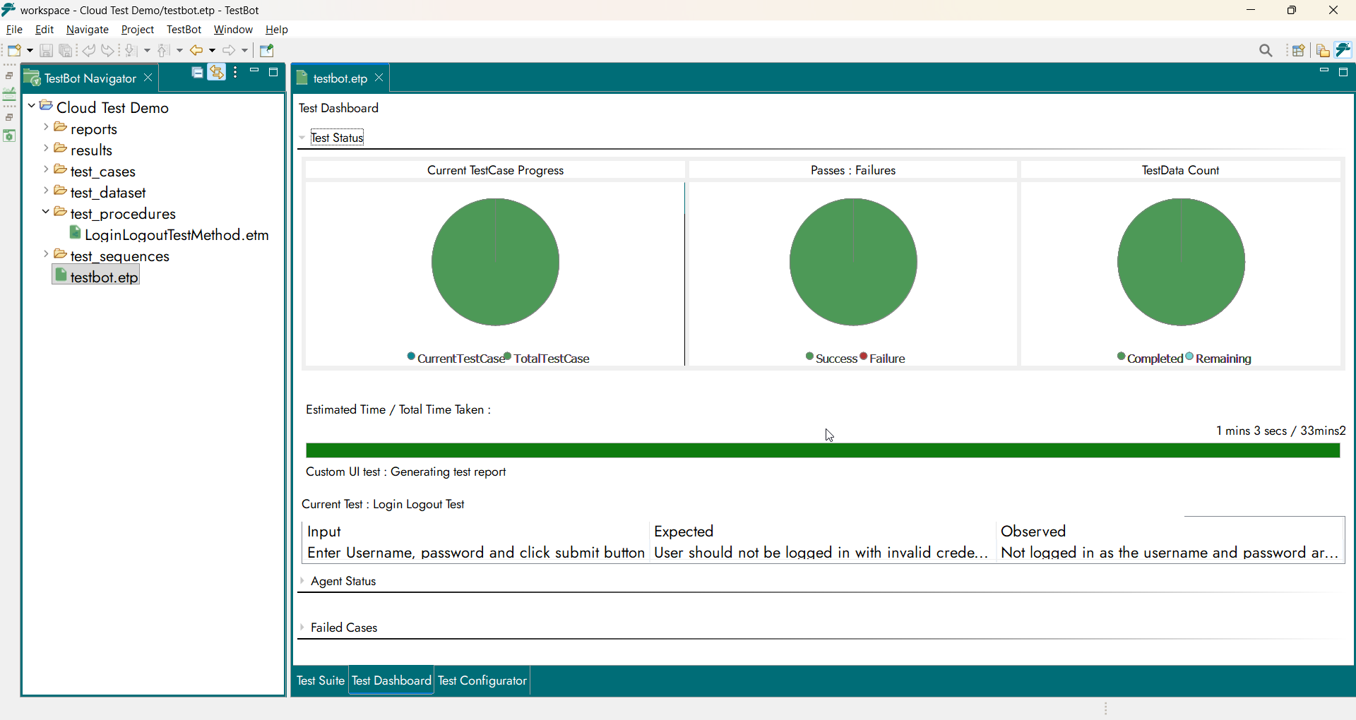 Upon clicking Run, execution begins, and the Test Dashboard opens.
